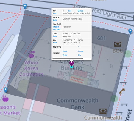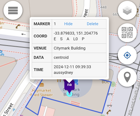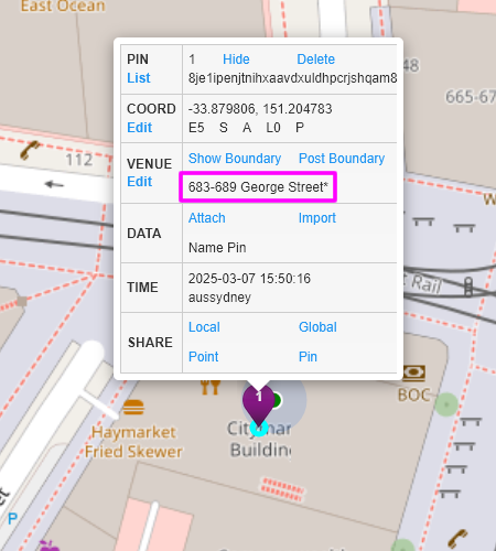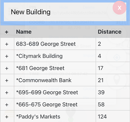 In the example below, the venue name is changed from Citymark Building to 683-689 George Street (also indicated by the purple location pin) after clicking on 2 in the Distance (third) column.