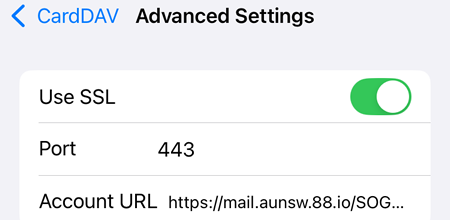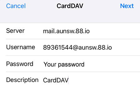 89361544@aunsw.88.io.If the Server is not detected, please enter https://mail.aunsw.88.io/SOGo/dav/89361544@aunsw.88.io/Contacts/https://mail.aunsw.88.io/SOGo/dav/89361544@aunsw.88.io/Contacts/All the address books are shown on the CardDAV main page. The default address book is